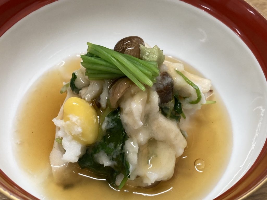 ⑧ 小鍋に③の蒸し汁とAを入れて煮立て、水溶き片栗粉でトロミをつけます。葛粉でトロミをつける場合は、煮立てる前に葛粉を溶いて火にかけましょう。