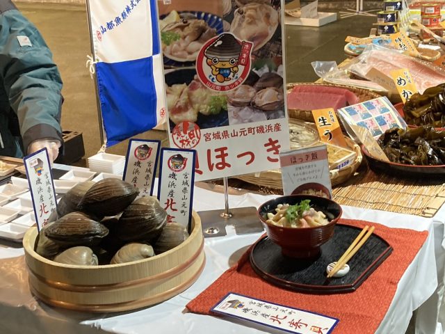 今回はほっき飯の試食も振舞い、山元町のキャラクター、ホッキーくんも登場!PRに一役かってもらいました!